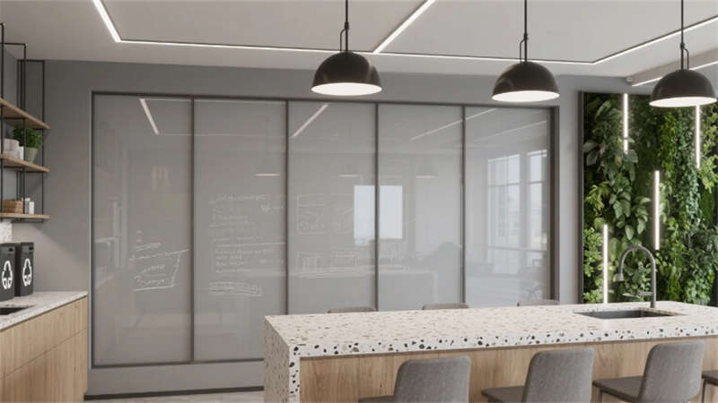 空間外立面的垂直花園立柱與線性光帶構(gòu)成城市界面新語言,內(nèi)部則以隱藏式照明系統(tǒng)模擬天光軌跡,模糊室內(nèi)外界限。開放式工區(qū)透光玻璃隔音艙形成彈性協(xié)作單元,模塊化電源系統(tǒng)與懸浮線槽詮釋隱形秩序??偛棉k公室全景幕墻將城市天際線引入室內(nèi),與大理石肌理墻面形成虛實(shí)對話。茶水間水磨石中島與苔蘚微景觀相映,磁性玻璃墻記錄著即興迸發(fā)的靈感火花。