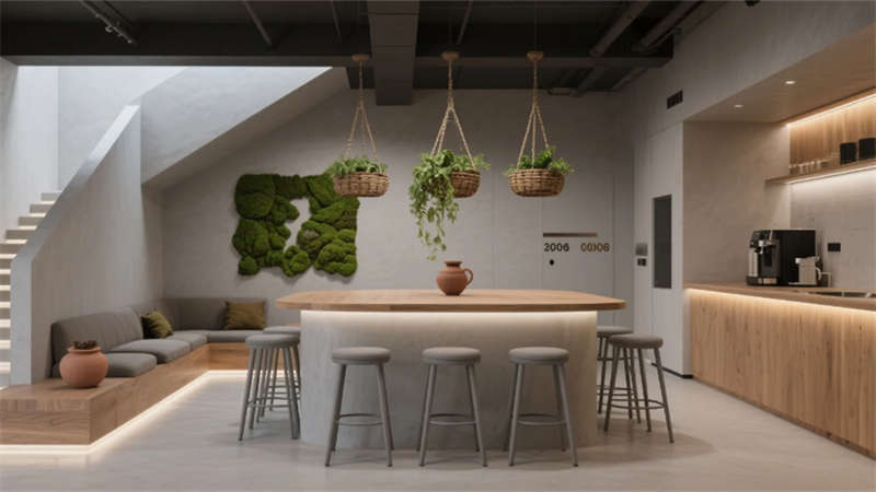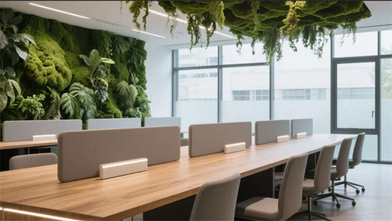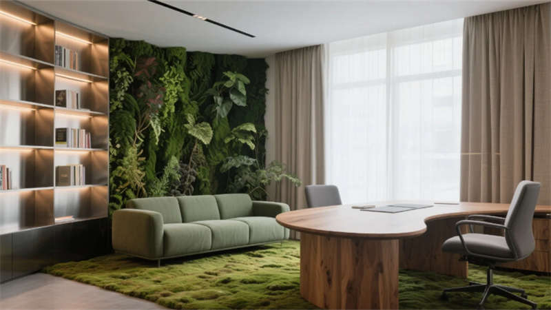 該設計以“自然共生”為脈絡,將綠植生態(tài)系統(tǒng)與現(xiàn)代辦公需求深度融合。入口處以苔蘚藝術臺與流水光墻奠定基調(diào),流動的綠意從呼吸幕墻延伸至開放辦公區(qū),原木桌面在漫射天光中模糊室內(nèi)外界限。獨立辦公室的垂直森林墻與靜音艙的苔蘚隔斷,在私密空間延續(xù)生態(tài)語言。
