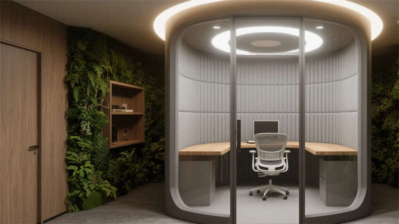 貫穿始終的啞光木紋、編織材質(zhì)與暖灰調(diào),弱化傳統(tǒng)辦公的冷硬感;隱藏式光源在艙體、書架與吧臺處暈染出靜謐氛圍。苔蘚地毯、垂吊蕨類等細節(jié),將合肥在地自然意象轉化為空間韻律,形成一座會呼吸的現(xiàn)代辦公聚落。