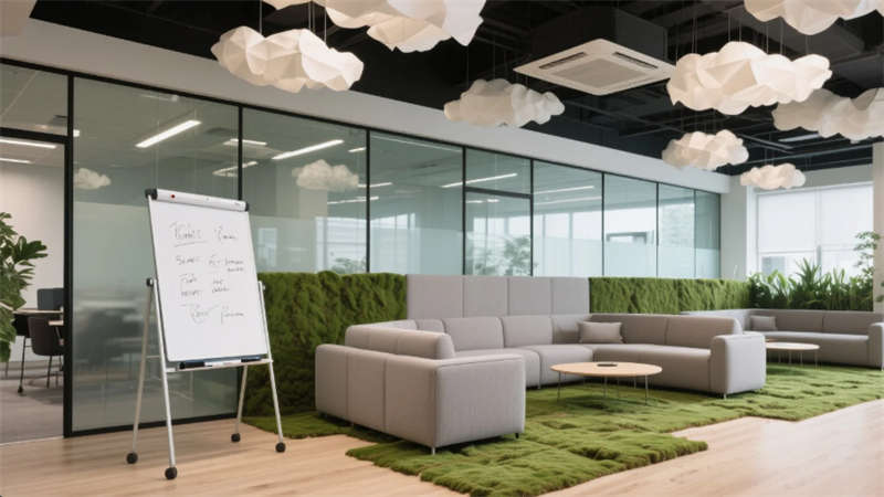 協(xié)作區(qū)域呈現(xiàn)有機張力:茶水間的階梯式布局激發(fā)非正式交流,可書寫玻璃環(huán)繞的頭腦風暴區(qū)釋放創(chuàng)造力,而模塊化沙發(fā)的灰綠色調(diào)呼應窗外城市綠景。多功能廳的折疊原木階梯與生態(tài)屏幕,在科技與自然間取得平衡。