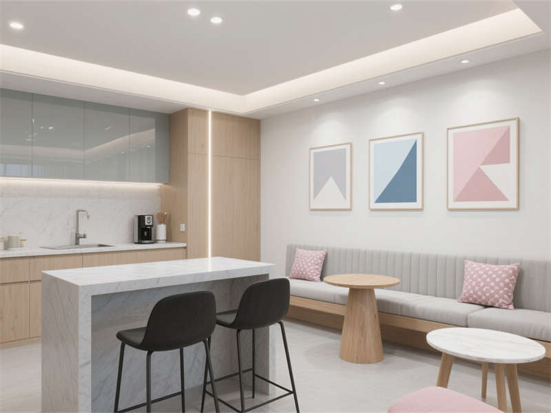外觀設(shè)計(jì)上,采用淺灰色墻面搭配超白玻璃幕墻,玻璃內(nèi)側(cè)的品牌標(biāo)識(shí)與門前綠植相呼應(yīng),弱化了建筑的冷硬感,展現(xiàn)出簡約大氣的辦公形象。進(jìn)入室內(nèi),前臺(tái)接待區(qū)以淺灰與米白為基礎(chǔ)色調(diào),L型前臺(tái)搭配柔和燈光,等候區(qū)的布藝沙發(fā)與原木元素結(jié)合,給訪客帶來溫和專業(yè)的第一印象。?
