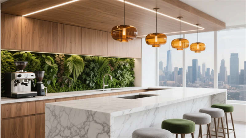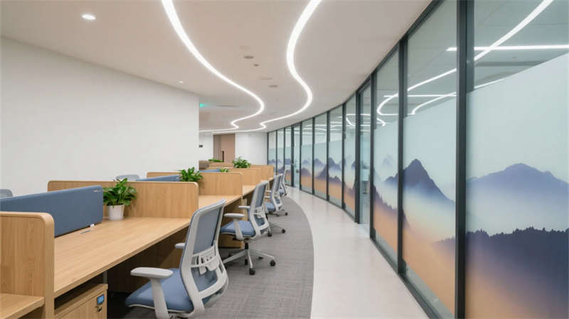 階梯式沙龍區(qū)打破傳統(tǒng)會議格局,弧形看臺激發(fā)平等交流,全息投影讓思維可視生長。茶水間垂直花園與咖啡香氣交織,成為非正式碰撞火花的土壤。獨立辦公區(qū)低隔斷設計延續(xù)視野通透,曲線燈帶如枝蔓延伸,提示著人與空間的有機聯(lián)結(jié)。