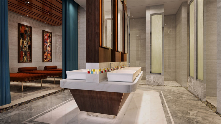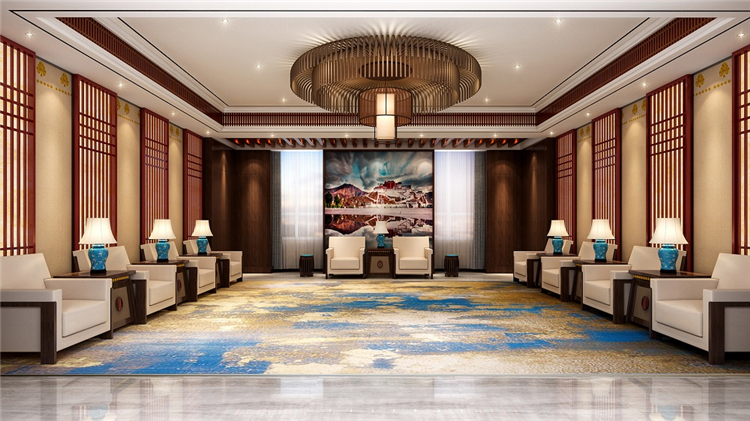設(shè)計(jì)師同時(shí)考慮到地域民族文化和功能實(shí)用性,結(jié)合現(xiàn)代簡約與傳統(tǒng)藏式風(fēng)格,為往來的游客提供一個(gè)放松休憩的完美場所。設(shè)計(jì)師主要運(yùn)用藏藍(lán)、金黃、喇嘛紅等濃重色彩進(jìn)行搭配,靈感既來自于藏族傳統(tǒng)文化及宗教藝術(shù),也來自于雪域高原山高天藍(lán)水長花艷的自然景觀。借用柱網(wǎng)結(jié)構(gòu)、幾何紋路、吉祥花等藏式建筑形式和圖案進(jìn)行裝飾和點(diǎn)綴,但將繁復(fù)的式樣盡量精簡平面化,取其古樸、神奇、粗獷的神韻,表達(dá)一種平衡、對(duì)比、和諧統(tǒng)一的構(gòu)圖規(guī)律和審美思想。