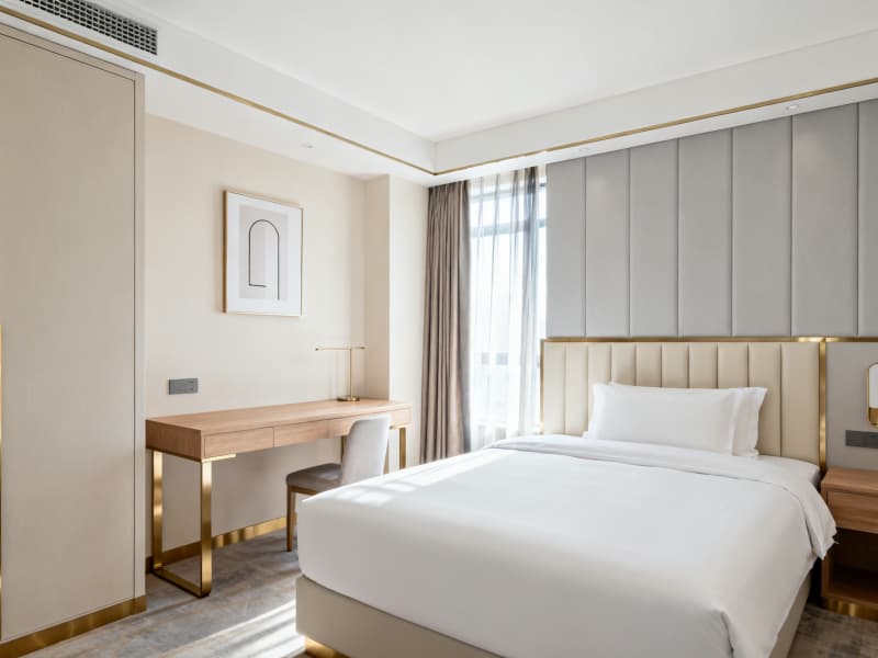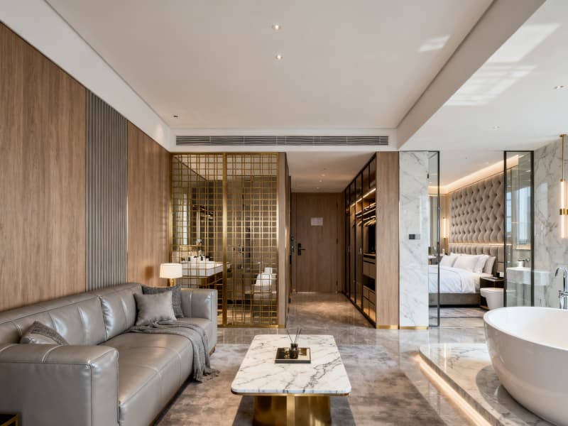 在空間布局上,充分利用4500平的開(kāi)闊尺度,合理劃分大堂、客房、餐廳、宴會(huì)廳、健身中心等功能區(qū)域。各區(qū)域銜接順暢,既保證商務(wù)出行的高效便捷,又滿(mǎn)足休閑旅居的舒適體驗(yàn)——例如標(biāo)準(zhǔn)客房注重實(shí)用性與靜謐感,行政套房強(qiáng)化尊貴感與功能性,宴會(huì)廳兼顧多元場(chǎng)景適配,健身中心與茶吧則豐富旅居生活維度。