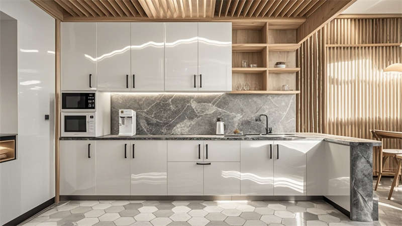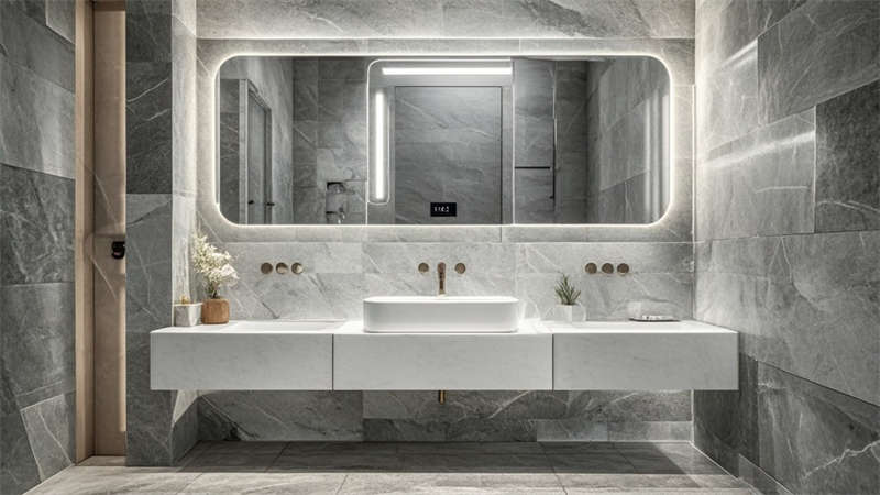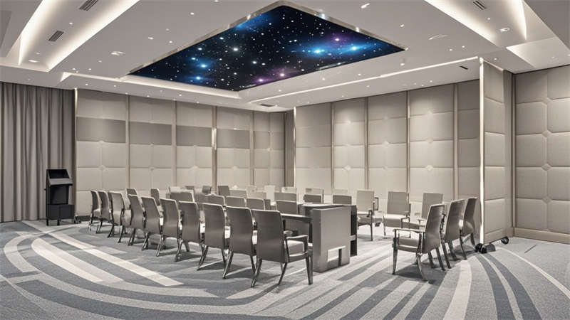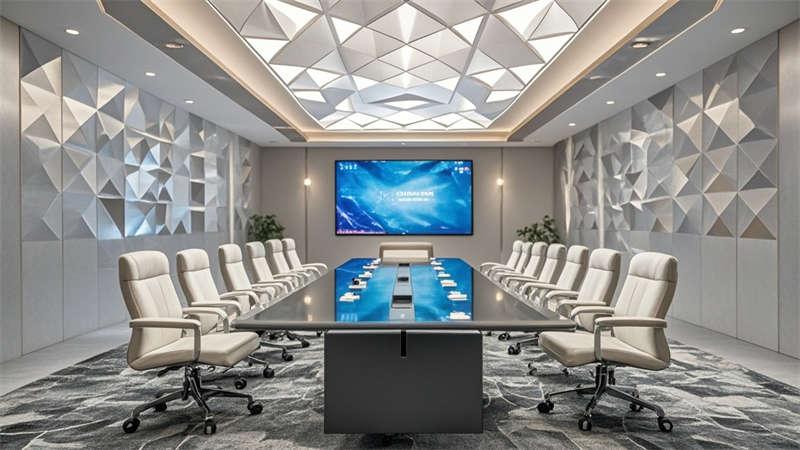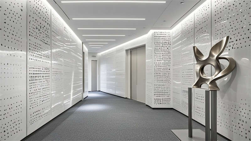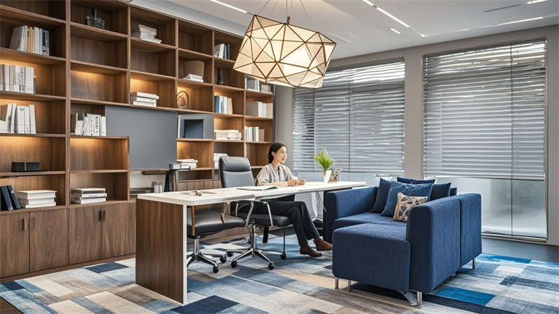 辦公區(qū)采用模塊化布局,配置智能升降桌和人體工學(xué)椅,裸頂噴灰工藝結(jié)合軌道燈系統(tǒng)實(shí)現(xiàn)靈活照明。色彩體系以高級(jí)灰為基底,搭配原木色系緩解視覺壓力,局部采用深藍(lán)跳色增強(qiáng)空間層次。材質(zhì)運(yùn)用注重環(huán)保性能,墻面大量使用穿孔吸音鋁板,地面采用防滑地膠與靜音地毯組合。