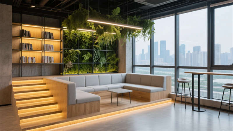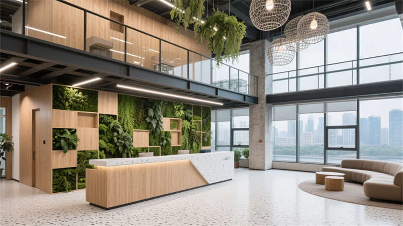 本項目以“自然滲透”與“靈活共生”為核心,將輕工業(yè)風(fēng)的理性框架與生態(tài)綠意巧妙融合??臻g打破傳統(tǒng)辦公割裂感,通過綠植墻體、透光天井與流動線條,在合肥城市肌理中營造出呼吸感十足的職場綠洲。