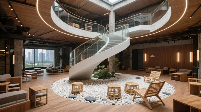 開放式核心區(qū)采用模塊化家具系統(tǒng),配合智能照明與聲學(xué)優(yōu)化,兼顧協(xié)作效率與專注需求;階梯沙龍與透明會議盒子激發(fā)即興創(chuàng)新,可移動隔斷實(shí)現(xiàn)場景自由切換。最具特色的是貫穿三層的垂直生態(tài)中庭,旋轉(zhuǎn)樓梯纏繞常綠藤蔓,成為連接空間的活力紐帶。