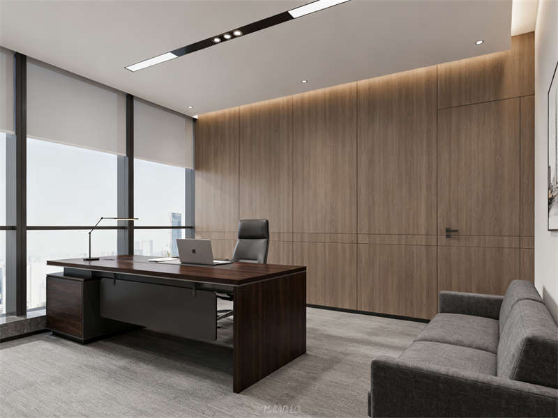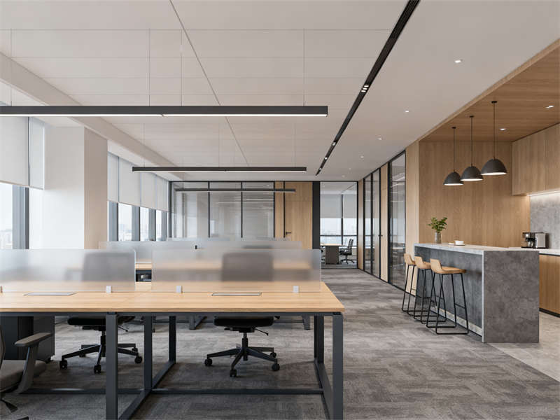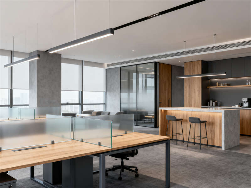 開放辦公區(qū)以通透協(xié)作為設(shè)計(jì)重點(diǎn),半透明磨砂玻璃隔板兼顧隱私與互動(dòng),木色桌面與深灰金屬支架結(jié)合,延續(xù)整體材質(zhì)基調(diào),搭配簡(jiǎn)約照明,營造專注且不壓抑的工作氛圍。獨(dú)立辦公室劃分出辦公與接待區(qū)域,木飾面背景墻搭配淺灰布藝沙發(fā),在保持商務(wù)感的同時(shí),增添柔和質(zhì)感,滿足私密溝通需求。