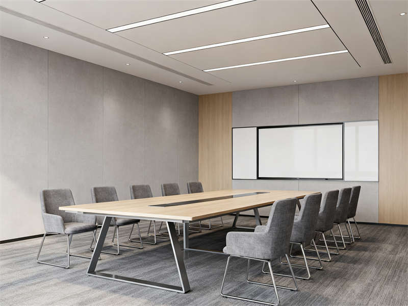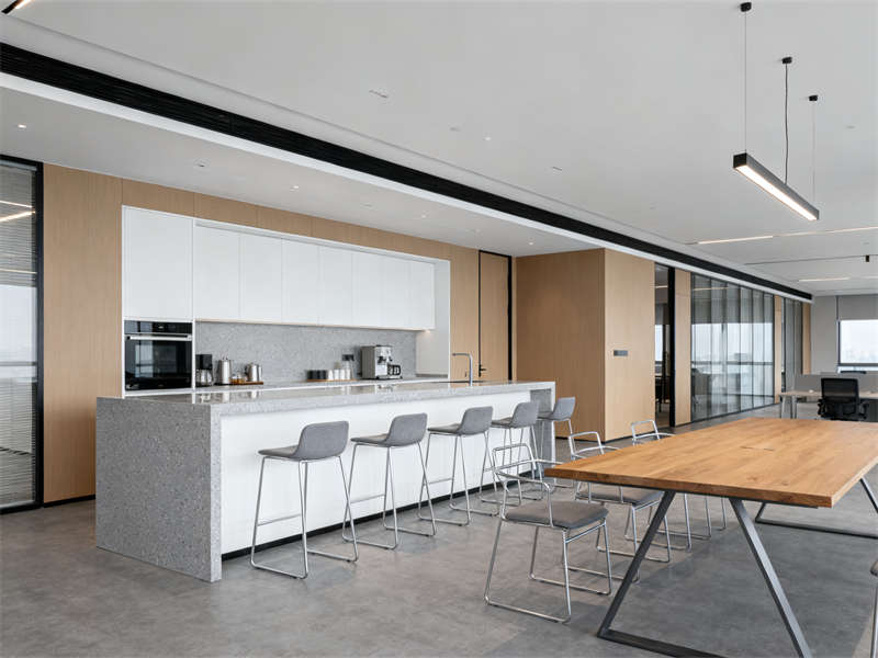 中型會(huì)議室圍繞協(xié)作功能展開,長條式會(huì)議桌與玻璃隔斷搭配,既保證空間開闊,又能與外部辦公區(qū)形成視覺聯(lián)動(dòng),灰色布藝座椅與頂部圓形吊燈呼應(yīng),讓會(huì)議場(chǎng)景兼具功能性與舒適感。茶水間則通過淺灰石英石臺(tái)面、木色護(hù)墻板與暖光燈帶,營造輕松休閑的氛圍,成為辦公間隙的放松節(jié)點(diǎn)。