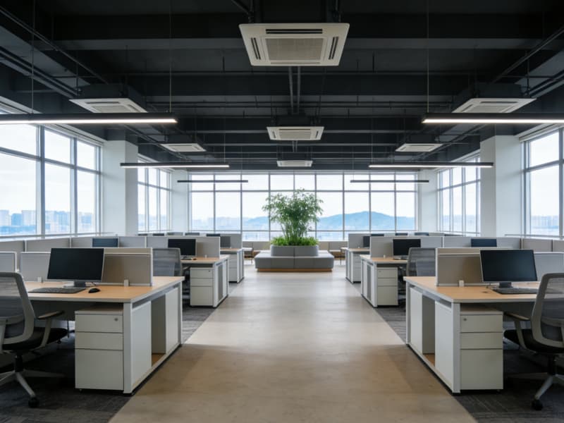 一樓大廳以“開(kāi)闊通透”為基調(diào),挑高設(shè)計(jì)搭配質(zhì)感石材地面與藝術(shù)裝置,融入徽派建筑的留白意境,入口處的智能導(dǎo)覽系統(tǒng)提升訪客體驗(yàn)。公共辦公區(qū)采用開(kāi)放式布局,靈活工位與協(xié)作空間錯(cuò)落分布,搭配綠植隔斷與自然采光,構(gòu)建舒適高效的協(xié)作氛圍,三張不同功能的辦公區(qū)效果圖分別呈現(xiàn)獨(dú)立辦公、團(tuán)隊(duì)協(xié)作與休閑洽談場(chǎng)景。