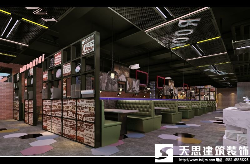 燒烤店裝修設(shè)計墻面的處理:以前沒有墻紙之類裝潢的時候,大多燒烤店都是白色或者圍一些墻裙,白色容易弄臟而且不好清洗,時間長了墻面的衛(wèi)生會很大的影響客人就餐的心情,因為燒烤店油性比較多,客人吃飯手腳不老實來回蹭。墻面可以貼墻紙,但是顏色選擇上不但看起來干凈、明亮而且不能易臟,這個裝修感覺,磚木色的地板任何時候看起來都是顏色亮麗。