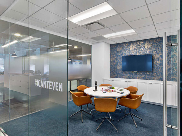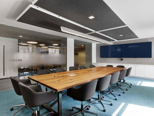 清朗凝練的空間更多了一份雍容典雅的都市氣質(zhì),依舊以藍(lán)色標(biāo)志色為裝飾主調(diào),只是這次的藍(lán)色更暗雅、更富于細(xì)膩的變化。極富質(zhì)感的白蠟?zāi)静馁|(zhì)與黑色碳鋼構(gòu)件制作的家具,呈現(xiàn)出特有的都市氣質(zhì)。閉合的洽談室和會議室大多聚集于空間的內(nèi)部,以盡可能留出沿窗的空間令視線不被遮擋。連續(xù)而開敞的玻璃窗,讓室外城市美景盡收眼底,心情也變得豁然開朗。