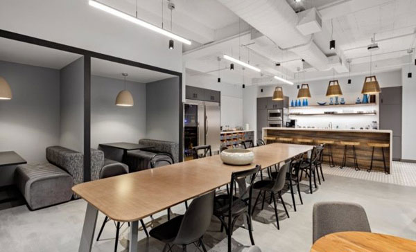 大型咖啡館和食品儲(chǔ)藏室是為協(xié)作而設(shè)計(jì)的,是辦公室的公共中心。一張長(zhǎng)長(zhǎng)的餐桌、展位、座位和休息區(qū)為非正式會(huì)議、社交聚會(huì)的地方。