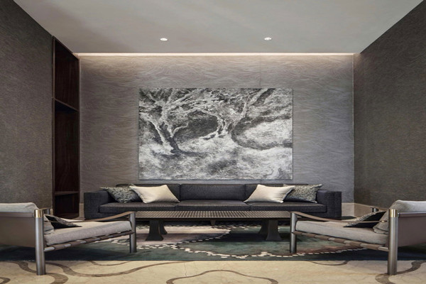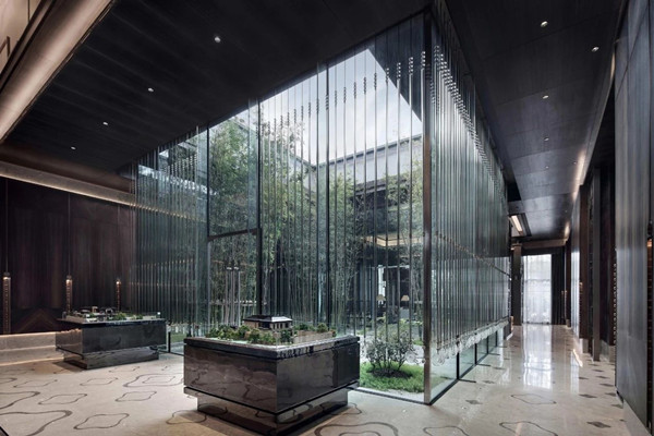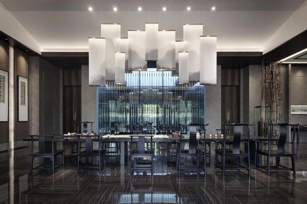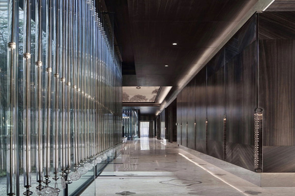 細致的從空間注入圓、點、線,繁縟而有節(jié)配上雅致玻璃吊飾,自然光映出流光溢彩,水的意象呈現(xiàn)東方肌理,光影交織突顯五重院落的建筑,彰顯東方大境。