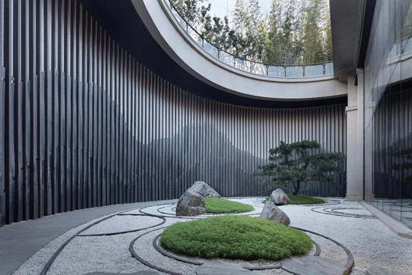 此次中式會所的設(shè)計實現(xiàn)與自然和諧共生,為會所的實際功能描上一層?xùn)|方意境。“久在樊籠里,復(fù)得返自然”,當(dāng)年陶淵明在《歸園田居》中的詩句,反映我們現(xiàn)在的生活發(fā)展愈是急速,建筑日漸擠擁,空氣愈見沁淆,噪音擾人心神。