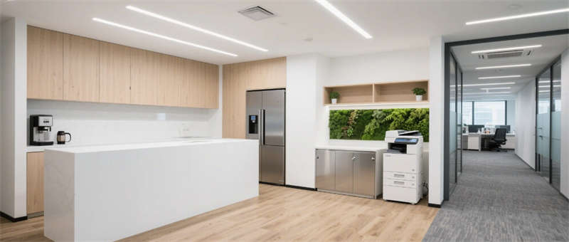 高管辦公室通過灰玻霧化膜實現(xiàn)私密與通透的辯證,胡桃木辦公桌與深灰沙發(fā)組演繹商務(wù)美學(xué),隱藏式智能控制系統(tǒng)將科技感融于無形??萍紩h室創(chuàng)新采用環(huán)形桌體與360°攝像系統(tǒng),陣列麥克風(fēng)與補光燈帶打造沉浸式遠(yuǎn)程協(xié)作場景。從光伏玻璃幕墻到模塊化綠植系統(tǒng),從智能升降辦公桌到節(jié)能設(shè)備集群,每個細(xì)節(jié)都銘刻著可持續(xù)發(fā)展的空間基因。