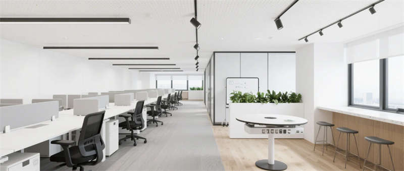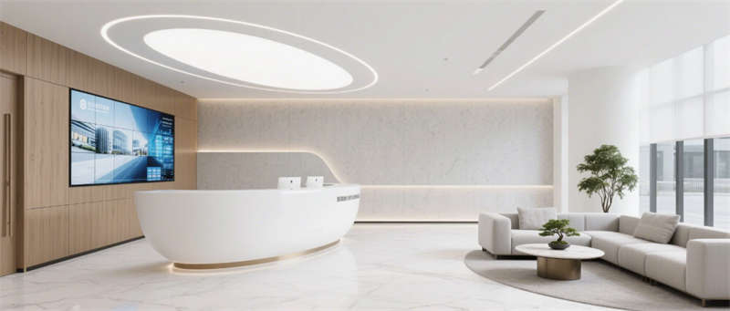 步入企業(yè)大堂,淺白大理石與溫潤木紋墻面形成材質(zhì)對話,懸浮式線性燈光如時空隧道貫穿空間。深藍(lán)色企業(yè)LOGO在弧形純白前臺形成視覺錨點,數(shù)字影像墻實時跳動的數(shù)據(jù)流與模塊化沙發(fā)區(qū)的綠植盆景構(gòu)成動與靜的平衡。辦公區(qū)采用模塊化升降系統(tǒng),穿孔吸音天花與協(xié)作島構(gòu)成靈活辦公矩陣,落地窗邊的高吧臺休憩區(qū)借綠植隔斷營造都市綠洲意境。