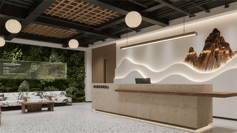 前臺(tái)大廳成為文化凝練的序章:層疊銅藝山形墻在光暈中起伏,夯土臺(tái)面與懸浮木構(gòu)的碰撞隱喻傳統(tǒng)與未來的對(duì)話。紙膜藝術(shù)燈如空中浮云,柔化工業(yè)風(fēng)的冷峻基調(diào)。