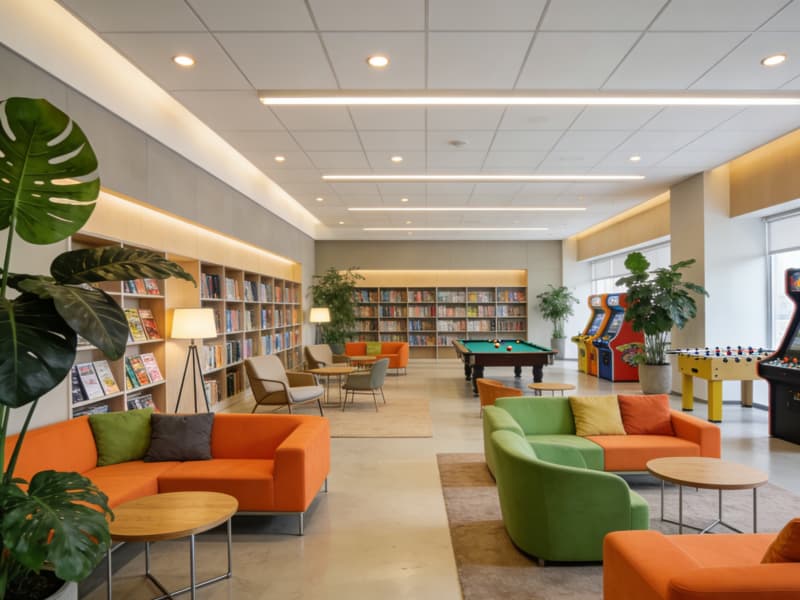 員工休息區(qū)充滿活力與溫馨,彩色的沙發(fā)錯落擺放,搭配綠植與休閑桌椅,為員工打造一個放松身心的舒適角落。還設置了小型的閱讀區(qū)與娛樂設施,豐富員工的業(yè)余生活。