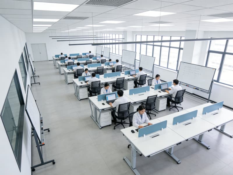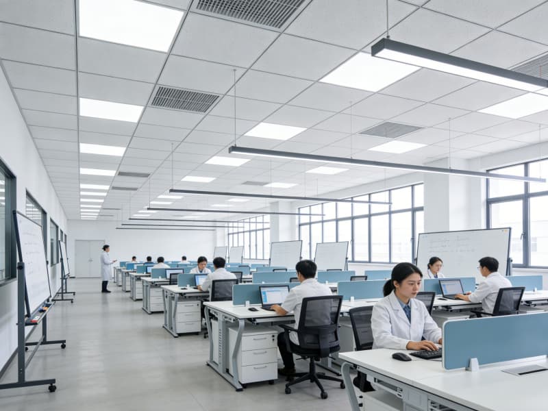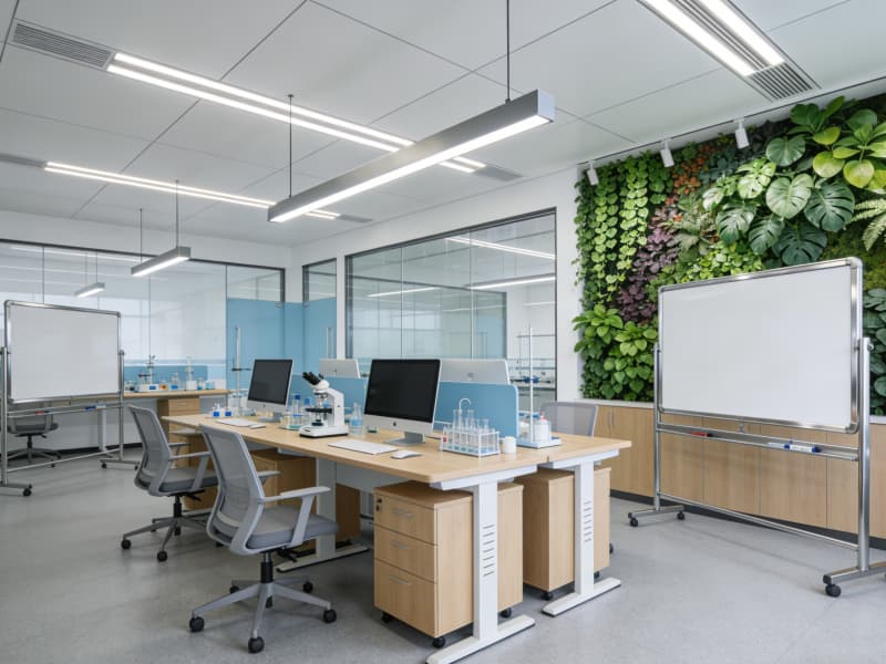 研發(fā)區(qū)營(yíng)造舒適且富有創(chuàng)意的氛圍。開放式的辦公區(qū)域配備智能升降辦公桌與可移動(dòng)白板,方便團(tuán)隊(duì)交流與頭腦風(fēng)暴。實(shí)驗(yàn)室采用模塊化設(shè)計(jì),實(shí)驗(yàn)臺(tái)布局合理,各類先進(jìn)儀器有序擺放。通風(fēng)系統(tǒng)保證實(shí)驗(yàn)環(huán)境安全,同時(shí)設(shè)置綠植墻,為科研人員舒緩壓力。