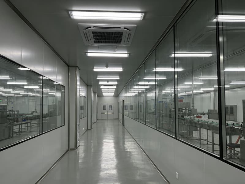 走進(jìn)內(nèi)部,生產(chǎn)區(qū)按照嚴(yán)格的GMP標(biāo)準(zhǔn)設(shè)計(jì)。地面采用無(wú)縫、耐腐蝕的環(huán)氧自流平,墻壁選用光潔、抗菌的金屬板,便于清潔與消毒。頂部的凈化空調(diào)系統(tǒng)與照明設(shè)備一體化設(shè)計(jì),保證生產(chǎn)環(huán)境的潔凈與適宜光照。不同生產(chǎn)工序區(qū)域通過(guò)透明玻璃隔斷劃分,既保證空間通透,又防止交叉污染。