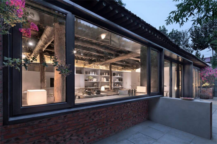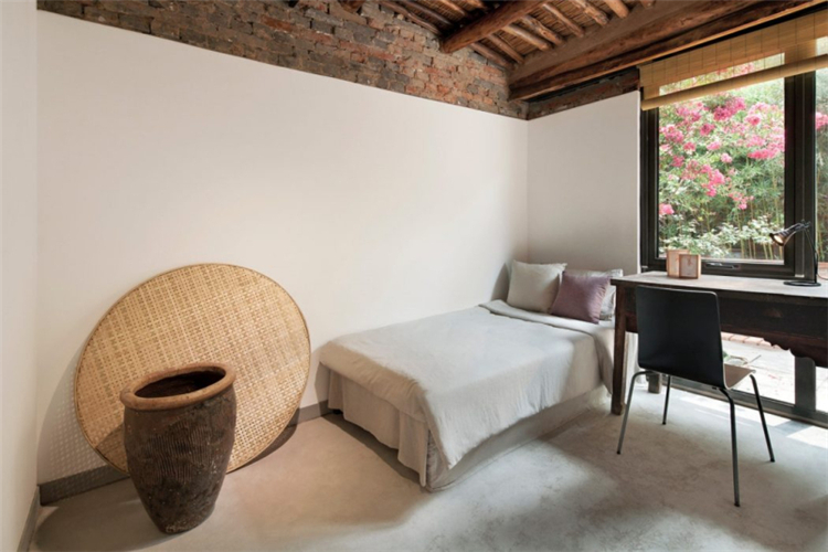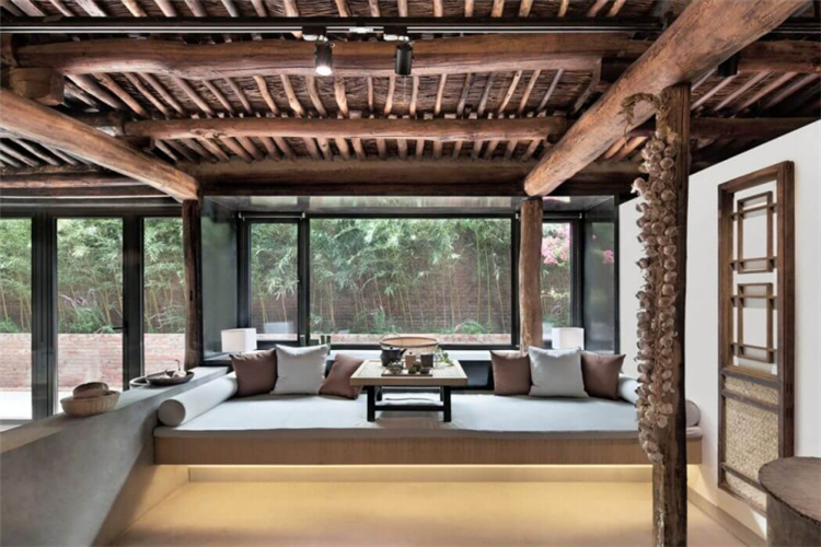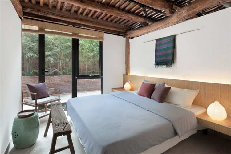 而我們?cè)谶@次的民宿的功能布局方面,我們根據(jù)與居民的詳細(xì)溝通,了解他們的日常生活和習(xí)慣,進(jìn)行調(diào)整,重新組織平面圖。在我們拆除吊頂后,更多的空間被釋放,原始的木結(jié)構(gòu)和稻草覆蓋的天花板紋理終于顯露出來(lái),講述了一個(gè)時(shí)間的故事。在現(xiàn)場(chǎng)勘察過(guò)程中,我們?cè)诮ㄖ镂鱾?cè)和鄰近墻壁之間發(fā)現(xiàn)了一條約80厘米寬的狹窄通道。因此,我們?cè)谧呃缺M頭向西側(cè)設(shè)計(jì)了一個(gè)觀景窗。在窗外,擺動(dòng)的竹影有助于將室內(nèi)空間與自然環(huán)境相連。