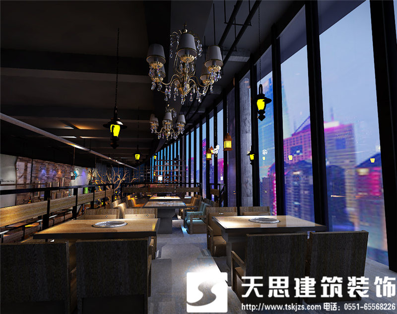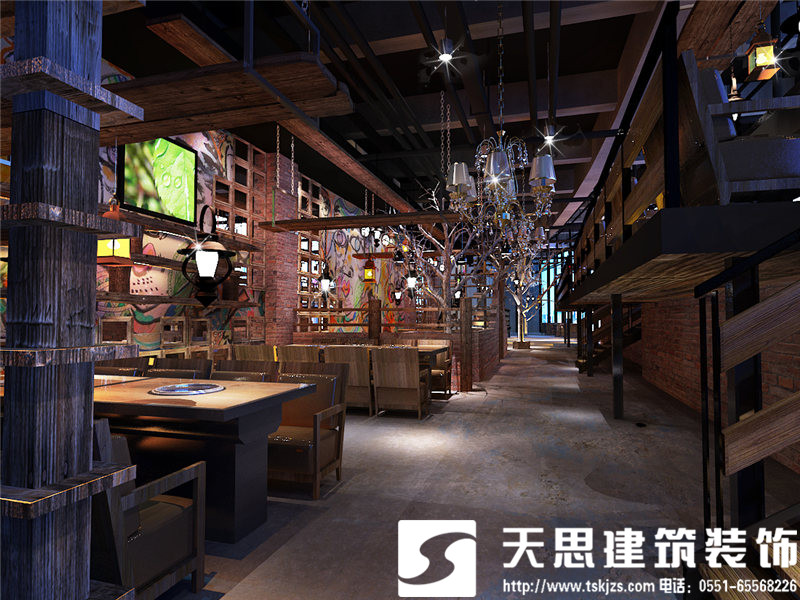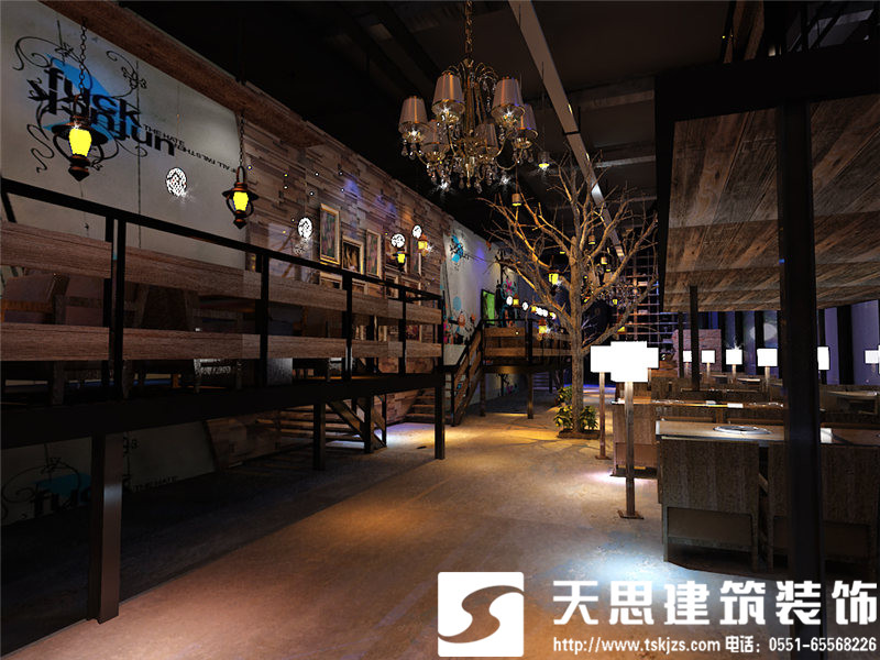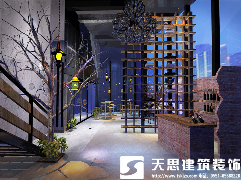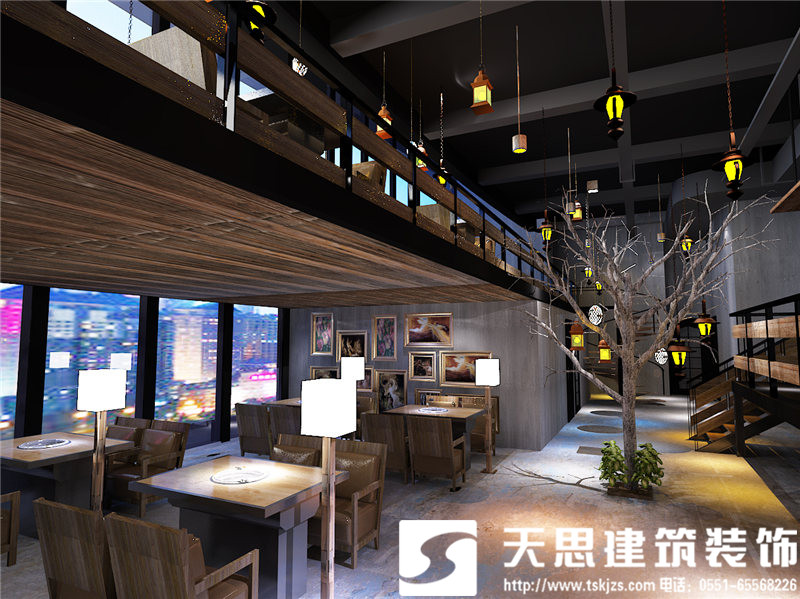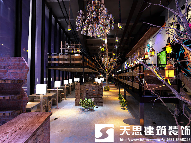 挑空的設(shè)計使一層的開敞空間簡潔而清晰,合理的區(qū)域劃分,凌空而起的二層餐飲區(qū),將挑空設(shè)計處理到最舒服的狀態(tài)。流光溢彩的琉璃燈讓簡約的設(shè)計愈發(fā)有了韻味,別致的風(fēng)景畫懸掛于清水混凝土墻面上,讓單調(diào)的色澤有了藝術(shù)的張力。頂面、地面和墻面只做簡單處理,采用清水混凝土或原木板等自然材料,不添加任何多余的修飾,如此精簡的設(shè)計卻絲毫不減空間的魅力。
