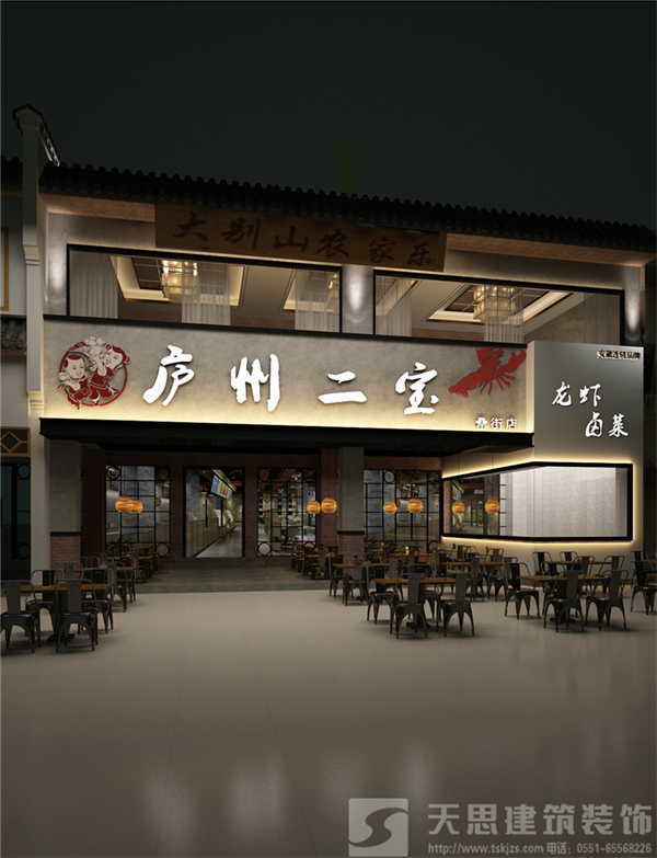店面裝修設計:麻辣蝦幾個大字和龍蝦圖形,讓客戶清楚的看到本店的主營業(yè)務,小空間大介紹,目的就是為了突出餐飲店的介紹,主次分明,是設計中的重要一環(huán)。