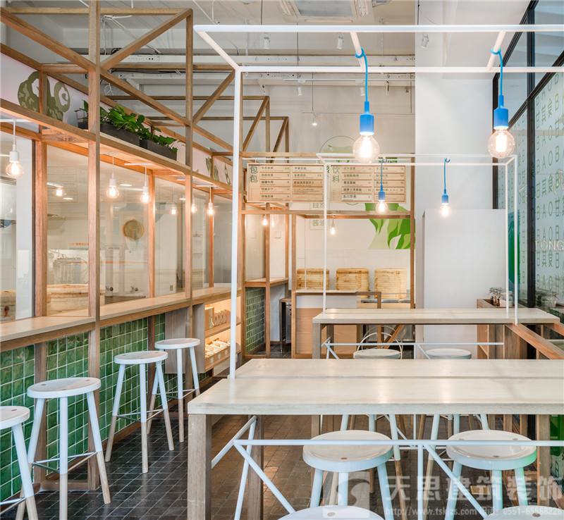 在室內(nèi)空間結(jié)構(gòu)上,我們傾注了大量巧思。玻璃間是包點(diǎn)制作區(qū),制作人員在玻璃間內(nèi)完成搟面、包餡和蒸制等一系列工序。玻璃間外的上部空間由木質(zhì)框架勾勒,以墻上的品牌標(biāo)志為背景,擺放著盆盆綠植,枝條垂墜而下,清新可人??臻g下部加入了吊燈和座位,一方面使得整體結(jié)構(gòu)更為完整,另一方面便于食客觀察了解制作過程。玻璃間上部兼具玻璃與木頭兩種質(zhì)感,下部的墻體由手工拋光的綠色瓷磚鋪就。店外,玻璃間的一面正對街頭,外延的木質(zhì)擱板既為顧客提供便利,也使得店鋪內(nèi)外更為渾然一體。
