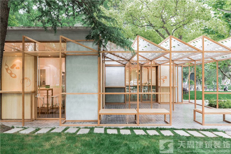 同樣運(yùn)用木材和綠色系,再結(jié)合可愛的鏤空圖案棚架,打造出一個清新溫暖的包子鋪。尖角狀的溫室結(jié)構(gòu)一直延展到室外空間,同時有兩面是被經(jīng)過鏤空圖案效果設(shè)計的可滑動木面板所圍合。