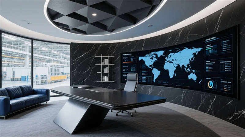 開放式辦公區(qū)打破傳統(tǒng)壁壘,蜂窩狀工位與懸浮綠植裝置詮釋靈動協(xié)作,透明屏幕上的數(shù)據(jù)流與玻璃隔斷投影的生產流程圖虛實相映??偛每臻g則如懸浮的智慧中樞,弧形落地窗將車間全景化作動態(tài)壁畫,金屬與大理石的碰撞間,流淌著決策與創(chuàng)新的電流。智能倉儲區(qū)立體貨架的金屬骨骼間,無人機如蜂鳥般掠過貨品,天光與電子標簽的光斑在環(huán)氧地面上跳動著數(shù)字時代的韻律。