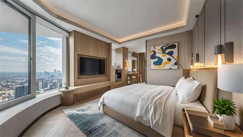 本案為6000平現(xiàn)代輕奢風(fēng)格商務(wù)酒店,以 ' 城市綠洲 ' 為設(shè)計(jì)理念,將自然元素與科技美學(xué)融合??臻g規(guī)劃采用動(dòng)靜分區(qū)原則,1-3 層為公共接待區(qū),4-8 層設(shè)置標(biāo)準(zhǔn)客房,9-10 層規(guī)劃行政專屬空間。色彩體系以香檳金、深海藍(lán)、暖灰為主調(diào),搭配天然木紋與石材肌理,營(yíng)造低調(diào)奢華的氛圍。智能系統(tǒng)貫穿全樓,包含環(huán)境光感調(diào)節(jié)、聲學(xué)優(yōu)化及空氣質(zhì)量管理。特色設(shè)計(jì)包括大堂三維立體藝術(shù)墻、客房可變光環(huán)境系統(tǒng)、頂層無(wú)邊際星空泳池,以及模塊化多功能會(huì)議系統(tǒng),充分滿足商務(wù)客群對(duì)品質(zhì)與效率的雙重需求。