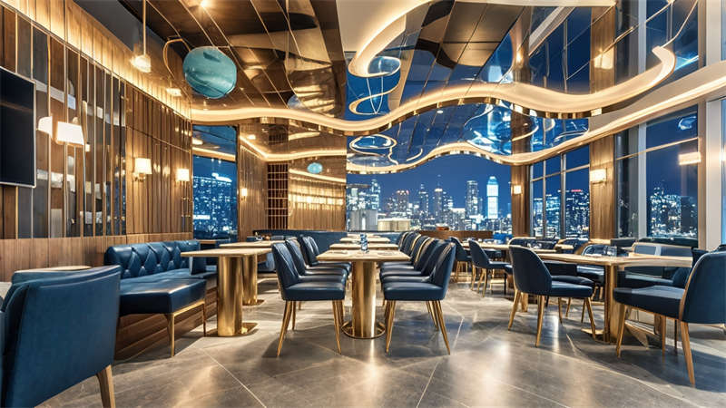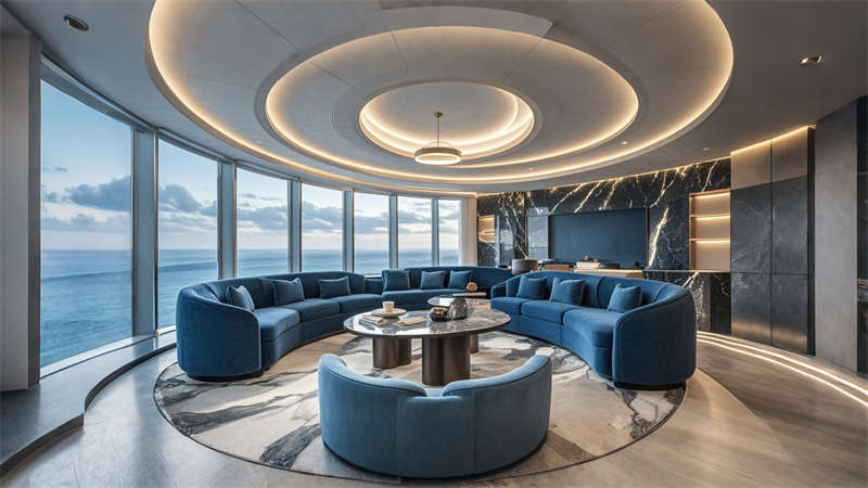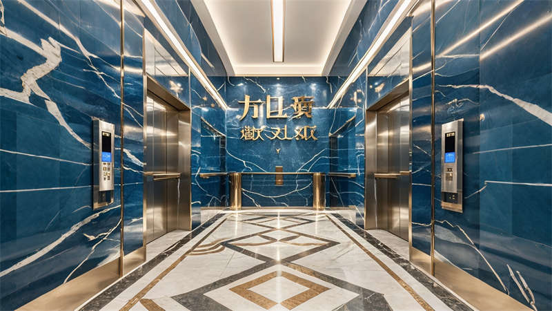 色彩體系以香檳金與深海藍(lán)為主調(diào),大堂采用香檳金金屬線條勾勒建筑肌理,搭配深海藍(lán)大理石營造視覺重心??头繀^(qū)運用暖灰硬包墻面平衡色彩強(qiáng)度,通過2700K暖光與4000K中性光分區(qū)照明塑造晝夜場景。材質(zhì)組合注重層次:大理石地面、金屬構(gòu)件、絨布軟包形成質(zhì)感三部曲。
