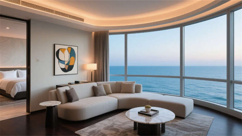 客房區(qū)域強(qiáng)調(diào)“靜謐中的科技感”,標(biāo)準(zhǔn)間通過木飾面隱藏?zé)魩c霧化玻璃衛(wèi)浴實(shí)現(xiàn)功能與美學(xué)的平衡;全景套房則以180度落地窗引入自然景觀,臨窗圓形浴缸與雙臺(tái)盆設(shè)計(jì)重新定義奢華體驗(yàn)。