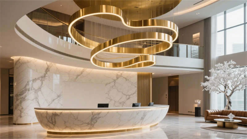 外觀設(shè)計(jì)以玻璃幕墻與天然石材的幾何拼接為視覺焦點(diǎn),日景通過景觀水池倒映建筑輪廓,夜晚則依托泛光照明凸顯立體層次,與城市天際線和諧共生。挑空兩層的大堂以金色流線吊燈與懸浮水晶樹藝術(shù)裝置為核心,大理石地面與弧形LED背光接待臺(tái)營造沉浸式抵達(dá)體驗(yàn),自然光與暖色燈光交織,傳遞低調(diào)奢華氣質(zhì)。