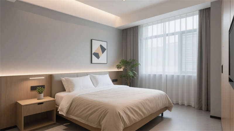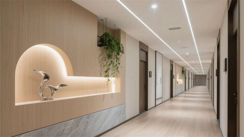 酒店以現(xiàn)代簡約美學貫穿始終,走廊作為串聯(lián)各區(qū)域的紐帶,延續(xù)了整體的設計語言?;⌒伪邶惻c懸浮天花板的線性燈光,柔和地引導動線,淺木飾面與石材的碰撞在低調(diào)中彰顯質(zhì)感。壁龕內(nèi)的藝術擺件與垂墜綠植,將自然氣息融入過渡空間,打破傳統(tǒng)走廊的單調(diào)感。
