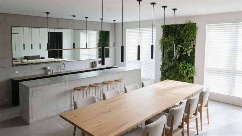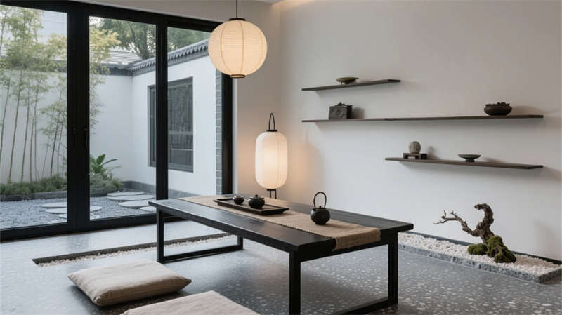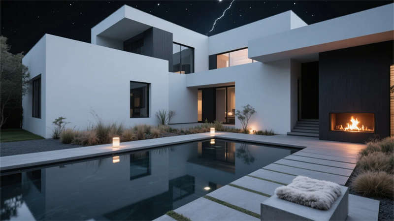 庭院成為生態(tài)樞紐,幾何水景倒映建筑體塊,耐旱植物與灰石板構(gòu)成低維護(hù)景觀。多功能廳通過(guò)靈活隔斷適應(yīng)共享需求,藝術(shù)品陳列架隨動(dòng)線旋轉(zhuǎn)生趣。整體摒棄繁復(fù)裝飾,用材質(zhì)本真觸感、光影時(shí)間軌跡與城市山水意境,營(yíng)造大隱于市的當(dāng)代棲居范本。
