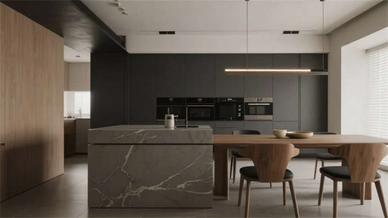 空間布局強(qiáng)調(diào)流動性與光影互動,落地窗成為連接內(nèi)外的畫框,將庭院竹影、城市天際線轉(zhuǎn)化為動態(tài)藝術(shù)裝置。無主燈設(shè)計(jì)搭配隱藏式照明系統(tǒng),在夜間暈染出柔和的光韻層次。衛(wèi)浴空間以灰調(diào)水磨石營造靜謐感,獨(dú)立浴缸臨窗而設(shè),沐浴時可見星月交輝。