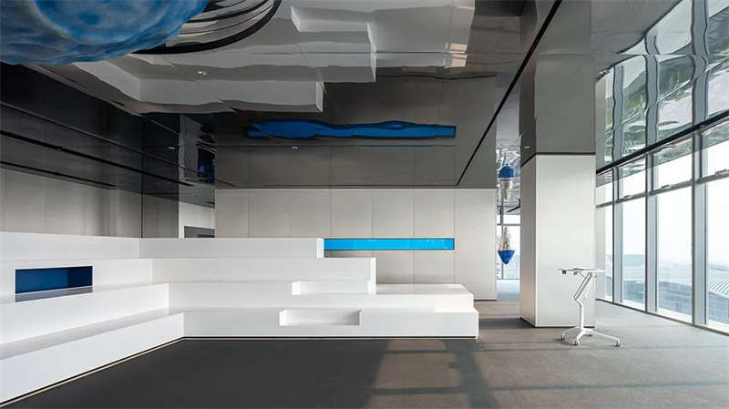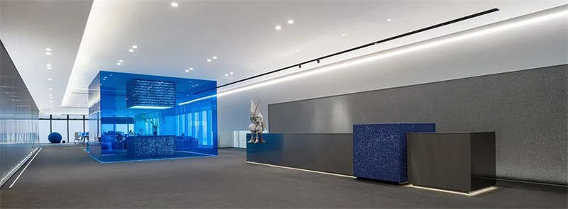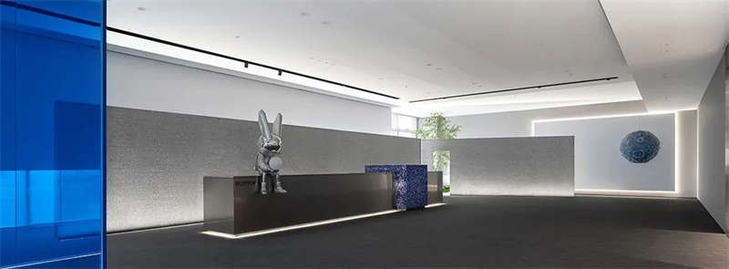 室內(nèi)空間由功能家具和裝置形成自然分隔,空間整體因祛除隔斷而產(chǎn)生了流動,這與科學巨匠斯蒂芬·霍金的宇宙觀具有一種相通性。太空兔和隕石一起來到這里,被安置在接待臺和會議室中,向來訪的人們講述宇宙的故事,猶如那些激動人心的創(chuàng)業(yè)事跡一樣,源于有限的奇點,產(chǎn)生突破界限的無窮能量。