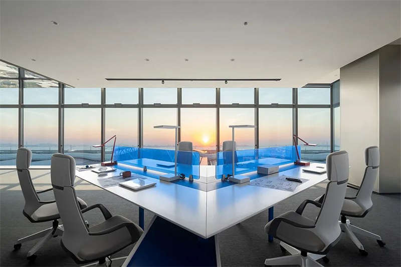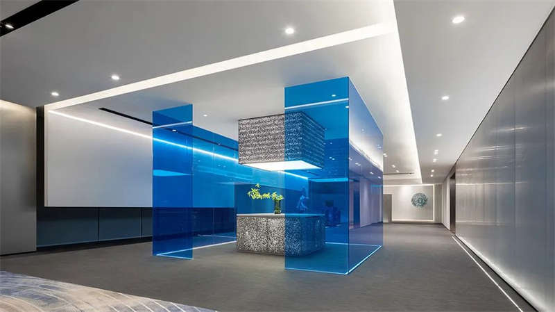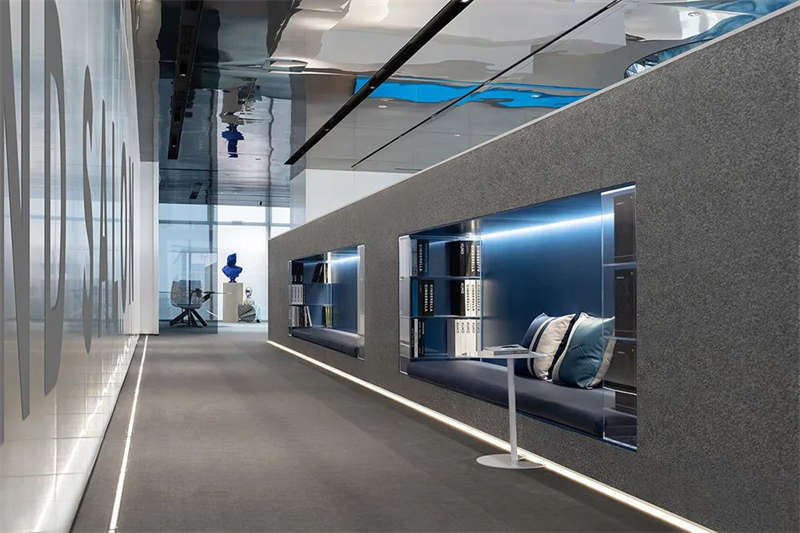 設計師在灰調(diào)的空間中,注入純凈的克萊因藍,高飽和度的單純色彩具有神奇的魔力,讓人們在強烈的視覺沖擊下迷失感官,與室外的海天融通一體,達致沒有感官桎梏的心靈自由;灰色則讓空間保有充裕的從容,以及留白的呼吸感。以此實踐在物質(zhì)之上,具有純粹精神的空間情景。