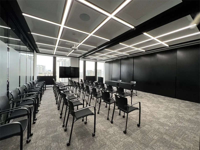 前臺區(qū)的兩條燈帶從吊頂延伸至側(cè)墻體底部,光源自上而下具有連貫性。培訓(xùn)室縱橫燈帶分割出的塊狀吊頂間,在施工時做了整齊對接的處理,以此增加空間的秩序感。齊整化的處理,凸顯出辦公空間嚴(yán)格的秩序性。