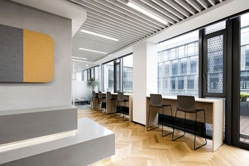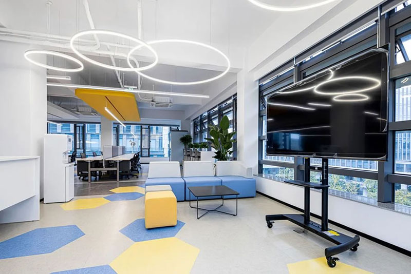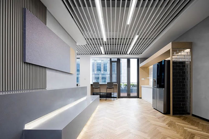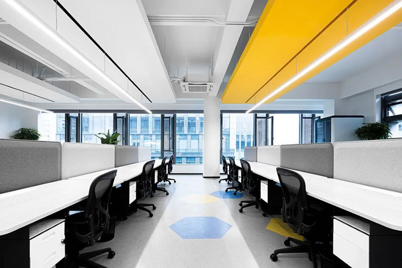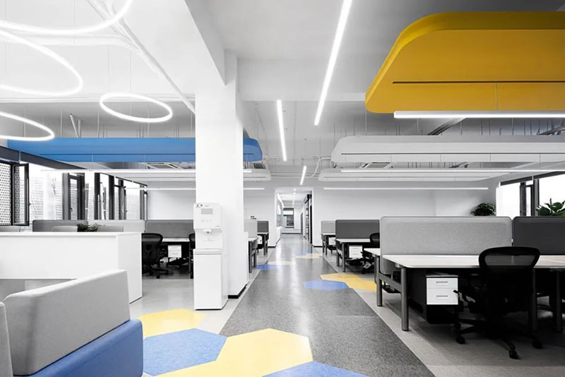 開(kāi)放工位的造型吊頂與地面色塊相互呼應(yīng),輕松有趣的氣質(zhì)穿梭在人員協(xié)作之間,中性色彩辦公家具在細(xì)節(jié)上增加耐用和降低視覺(jué)刺激導(dǎo)致的疲勞感。真正舒適的空間做到與功能需求一致,提供給使用者專心的設(shè)施和敏捷的思路。