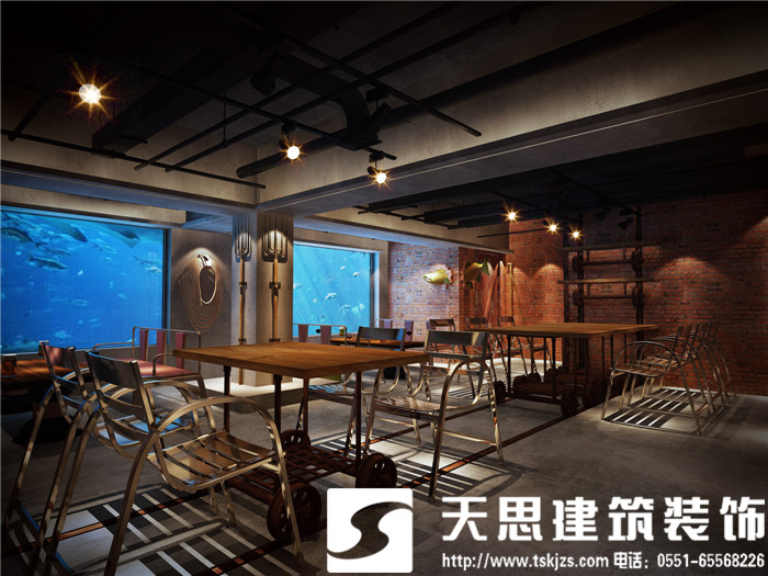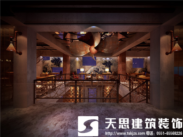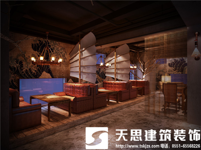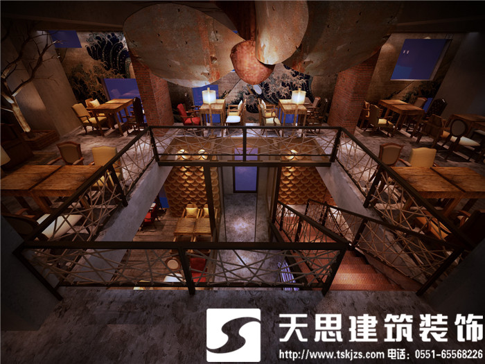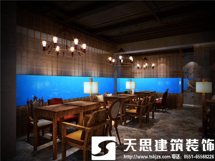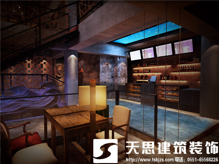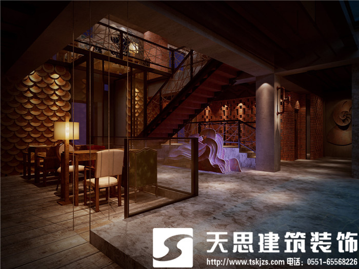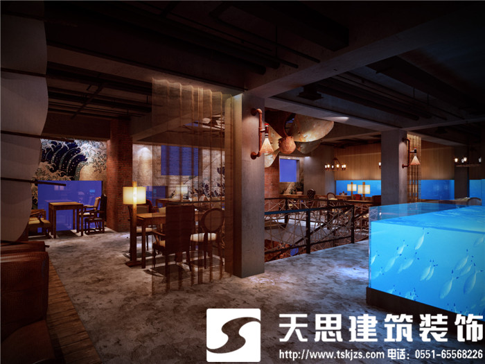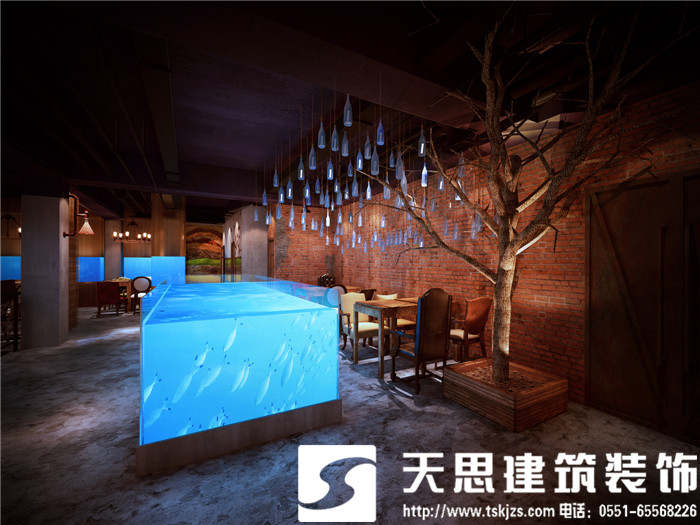 設計師讓空間呈現對話關系,彼此呼應。二層的長方形水族魚箱,在一樓即為吧臺頂層的雅致裝飾,自然傾瀉的燈光給吧臺區(qū)足夠的光源,簡約環(huán)保的理念貫穿在空間設計里。節(jié)次鱗比的魚鱗造型墻飾,富有藝術感,特用原木制作,將韻味進一步升華。