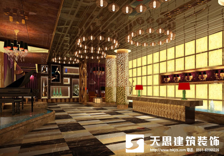 項(xiàng)目名稱:合肥潮流KTV裝修設(shè)計(jì) 設(shè)計(jì)面積:800平方 項(xiàng)目地址:安徽省合肥市 合肥潮流KTV裝修設(shè)計(jì),金銅色的燈光耀眼而又溫馨,大理石般的地板,更是襯托出了大廳的