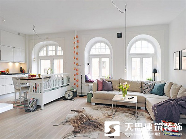 質(zhì)樸的大地色系沙發(fā)和地板融合了北歐客廳裝修設(shè)計對大自然的追求,精致的窗戶畫龍點睛的裝扮著北歐風格,轉(zhuǎn)角的布藝沙發(fā)舒適大氣,野性為十足的地毯低著森林的氣息,與大自然零距離接觸。開放式的北歐客廳裝修設(shè)計擁有開闊的視線和靈動的清新感覺。