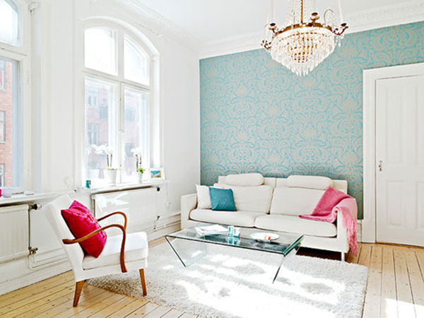 在華麗的水晶燈的照耀下,白色的北歐客廳裝修設(shè)計顯得清新亮麗,輕盈的塑料茶幾在柔軟的地毯上放縱的舞蹈,彩色的靠枕和墻紙是北歐客廳裝修的唯一色彩,藍花的壁紙烘托出北歐客廳的溫馨氣氛。