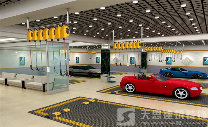汽車美容工位是汽車美容店的客戶車輛進行施工的場所,因此在這里裝修要盡量考慮水電氣股的吊放,可以兩個車位公用一個水電氣股,節(jié)省成本。