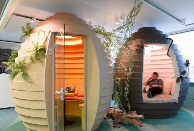 說起最吸引人跳槽的辦公室設(shè)計(jì),大家可能第一時(shí)間想到的就是谷歌公司的創(chuàng)意辦公室.辦公區(qū)域的每一處設(shè)計(jì)都別出心裁,融入了地方色彩,別具風(fēng)情.在這樣舒適愉悅的環(huán)境下辦公,谷歌總是能夠帶來許多令人眼前一亮的產(chǎn)品也有因可循了.谷歌辦公室以快樂健康,高效工作為目標(biāo).可以帶狗狗進(jìn)入辦公室(貓星人暫時(shí)不行)的人性化規(guī)定,打造與大自然融合的熱帶雨林辦公區(qū)域,提供挑選自己喜歡的廚師做飯的個(gè)性化餐廳服務(wù).谷歌的確稱得上"要?jiǎng)?chuàng)造世界上最令人感到幸福、最能激發(fā)生產(chǎn)力的工作場(chǎng)所."的辦公室.