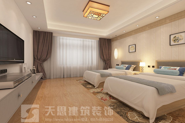 小型酒店客房,多以標(biāo)準(zhǔn)間、單人間為主,面積一般不會(huì)太大,不過可以利用延伸視覺效果的方法,來提升客房空間感。比如運(yùn)用由淺到深、富有層次感的彩色壁紙,搭配淡雅干凈的鋪蓋,安裝采光自然、光照充足的落地窗,延伸空間的同時(shí)也提高了舒適度。