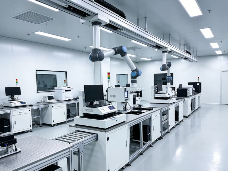 產(chǎn)品測試區(qū)以白色為主色調(diào),營造簡潔純凈的環(huán)境。各類先進(jìn)的測試儀器有序擺放,頂部的軌道式機械臂可輔助完成復(fù)雜測試流程。